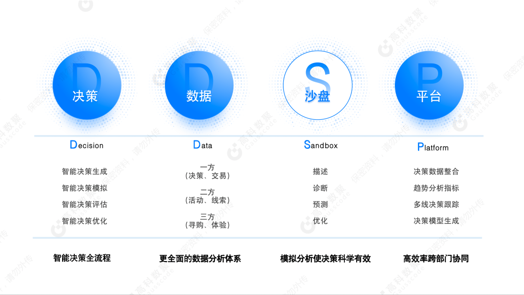 董琳介绍到,公海555000官网推出公海555000官网智慧决策平台DDSP(Decision Data Sandbox Platform),将从市场、销售、服务,以及智造研发等重要应用场景出发,从传统的经验主义决策方式向基于数据驱动的数智化决策全面升级。平台架设30+决策场景沙盘、三方多维数据指标、标签建设能力、百余预测决策模型能力,而且将持续在平台进行新增以及实现模型自我生长。